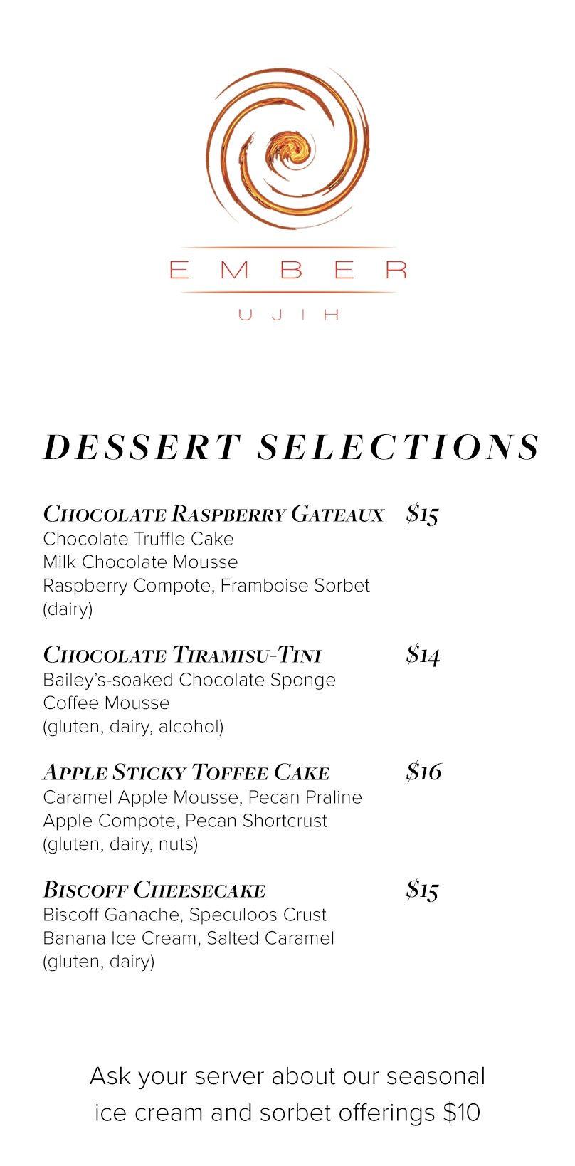 Ember is a destination dining experience serving the highest quality of steaks and seafood prepared over wood-fired grills, as well as a specialty cocktail menu, a whiskey library and an extensive wine list. Our expert and knowledgeable Sommelier and first-class Service Team will make your evening unforgettable.