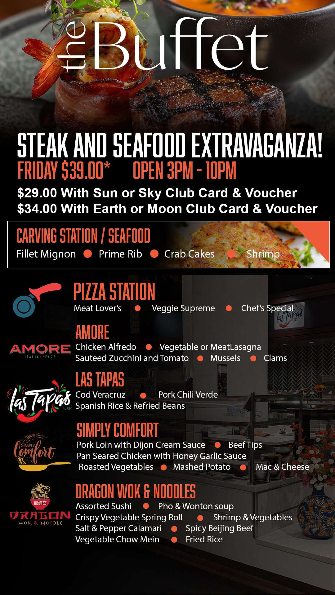 The Buffet is proud to feature four different, One Price, all-you-can-eat dining stations. Come enjoy our cutting-edge buffet with amazing foods from around the world. Enjoy our delicious salad, soup, and artisan bread stations. To finish your evening, try our beautiful selection of pastries, cakes, pies, and ice cream...Bon Appétit
